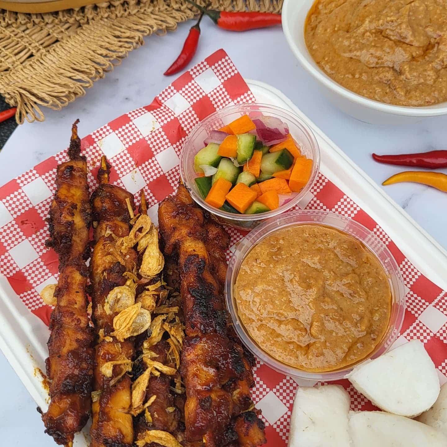 Indonesian BBQ skewers, ricecake, peanut sauce, pickles