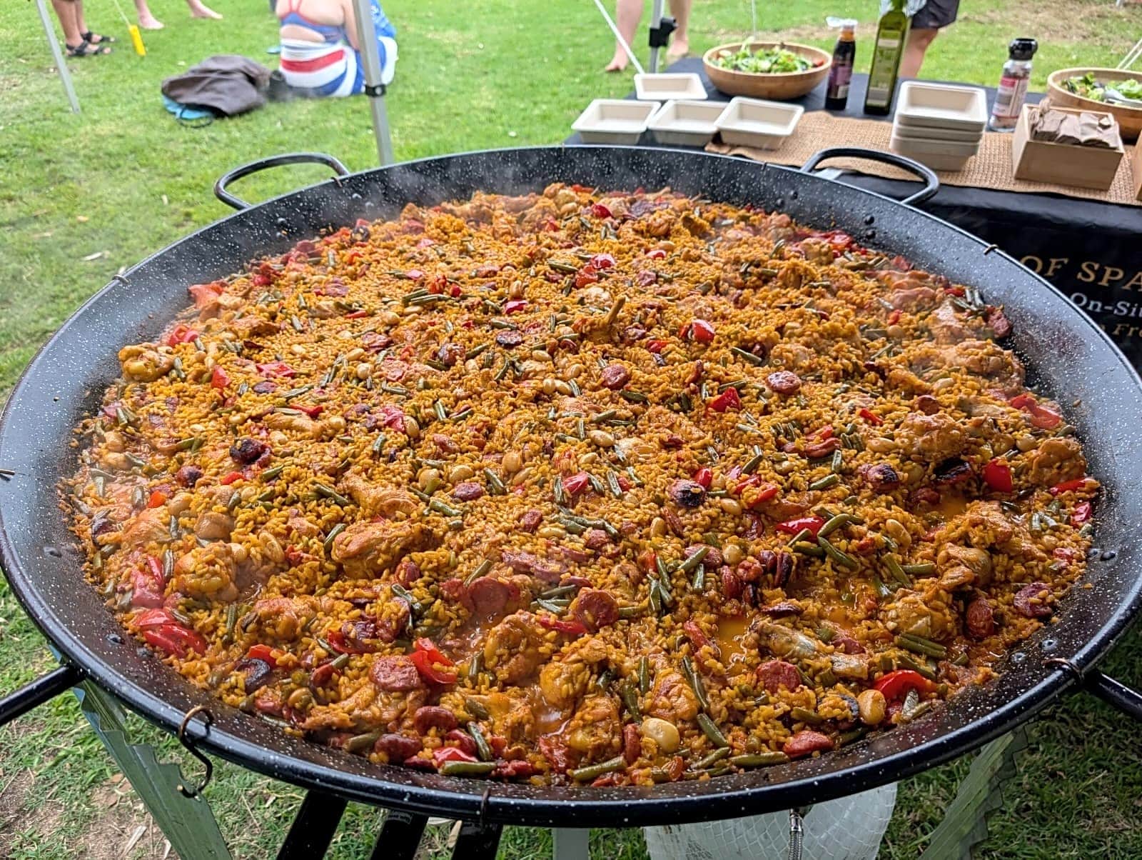 Traditional paella, chicken, seafood, vegan, sangria drinks