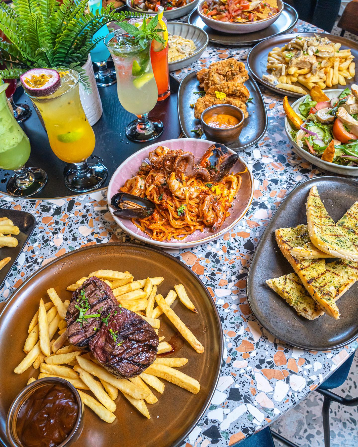 It’s got a modern vibe, comfy seating and a menu that covers everything from fresh seafood to burgers and loaded plates.