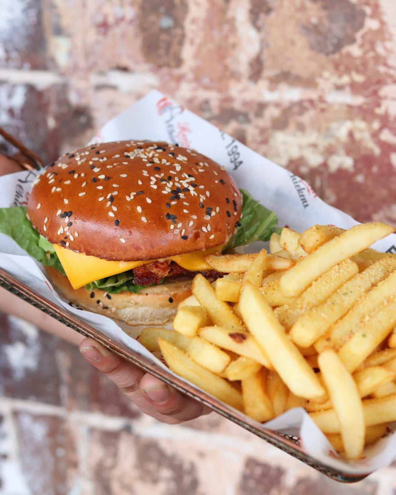 The burgers go hard too, stacked with hand-cut chicken, melty cheese and their signature franky mayo.