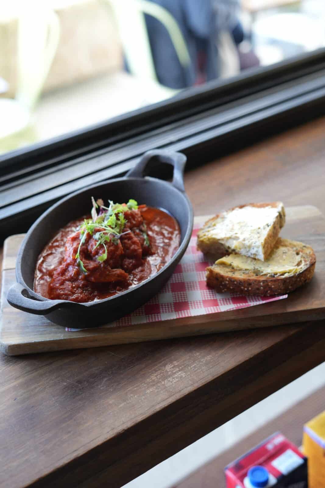 Lunch options like the southern fried chicken burger and spicy garlic prawns with sourdough are bold and flavour-packed.