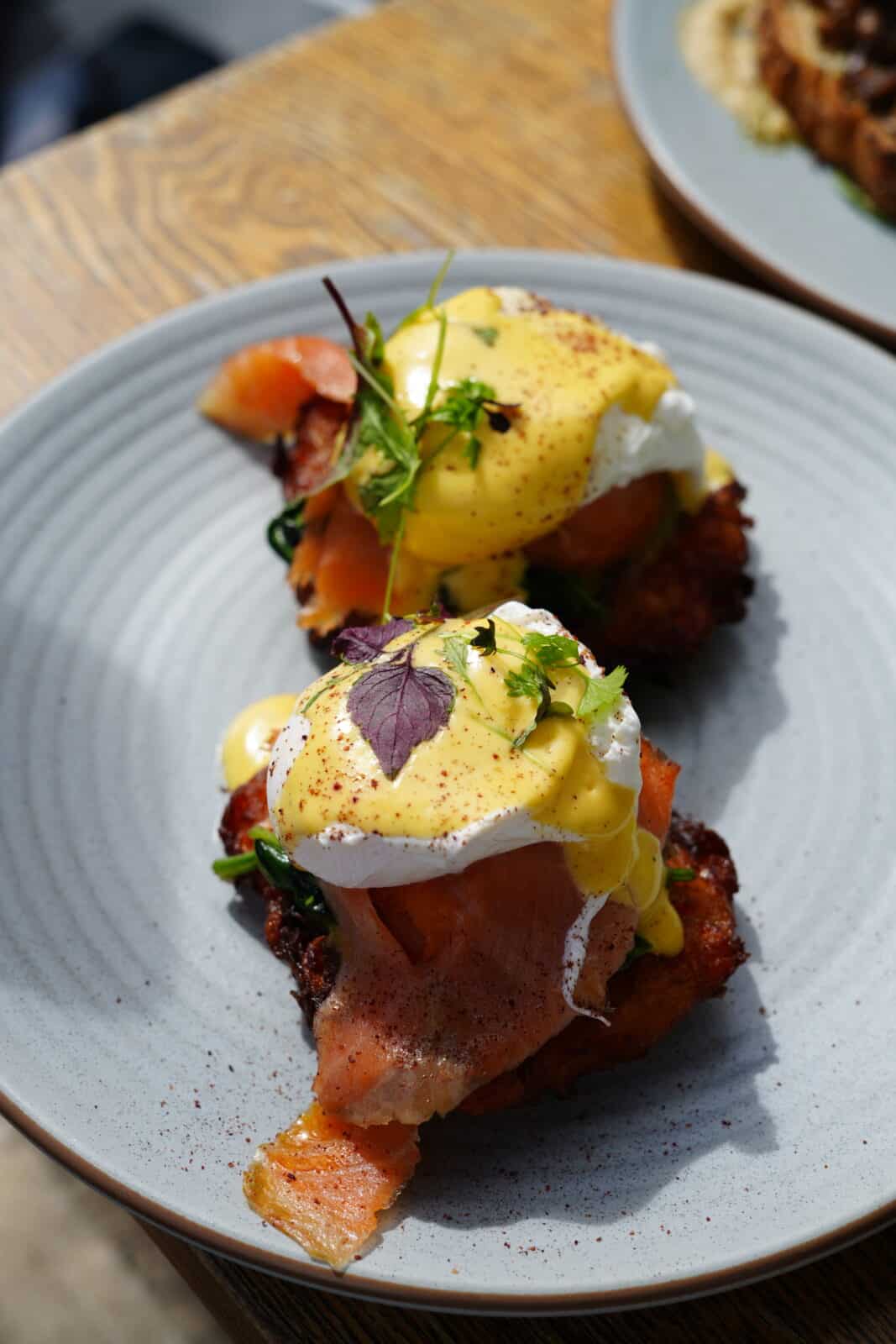 The hot potato benedict is a must-try — crisp sweet potato rosti, perfectly poached eggs, creamy avocado, sautéed spinach and rich house-made hollandaise.